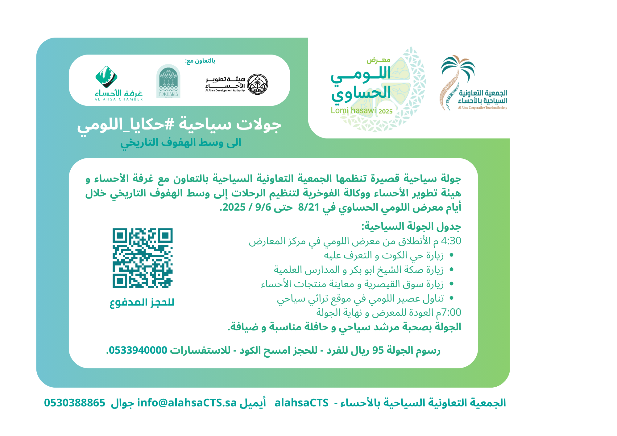 ✨ انضم إلينا في رحلة تنبض بالأصالة، حيث نأخذك إلى عمق واحة الأحساء لاكتشاف التراث، والتاريخ، وجمال الطبيعة. نزور خلالها مواقع تاريخية ومتاحف مميزة، ونتجول بين الحرفيين والفنانين في أسواقها الشعبية. في كل محطة، ستشعر بروح المكان وعراقة الحضارة.