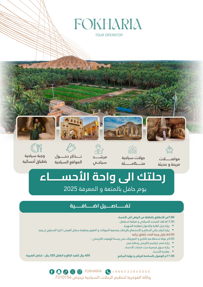 Join us on a journey of authenticity as we take you deep into the Al-Ahsa Oasis to discover its heritage, history, and natural beauty. We visit historical sites and museums, and wander among artisans and artists in its popular souks. At each stop, you will feel the spirit of the place and the tradition of civilization.